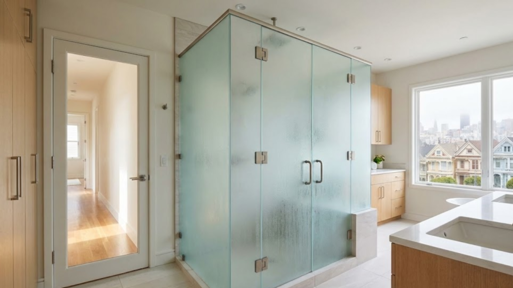 Frosted glass has an opaque texture that masks these imperfections. Hard water stains blend into the frosted surface rather than standing out as obvious white spots. Soap scum becomes less visible against the textured background. Fingerprints essentially disappear on properly frosted surfaces. This doesn’t mean frosted glass requires zero cleaning, but the maintenance burden drops dramatically compared to clear alternatives. Most homeowners find weekly cleaning sufficient for frosted glass, whereas daily attention is required for clear glass.